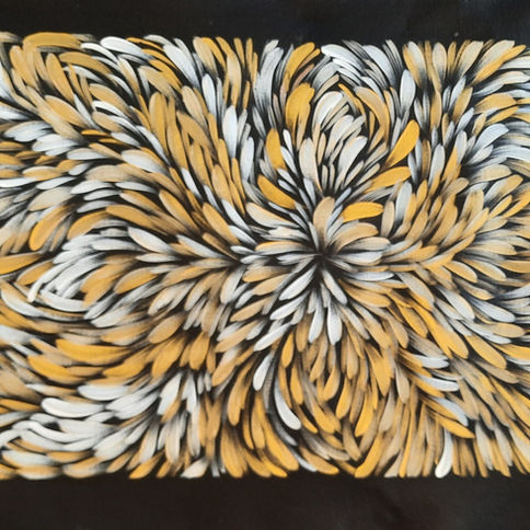 The luminous gold, white, and black tones symbolise both the physical and spiritual power of these plants — sources of protection, strength, and renewal. The swirling patterns evoke wind moving through Country, a reminder of the living energy that sustains both land and culture.
