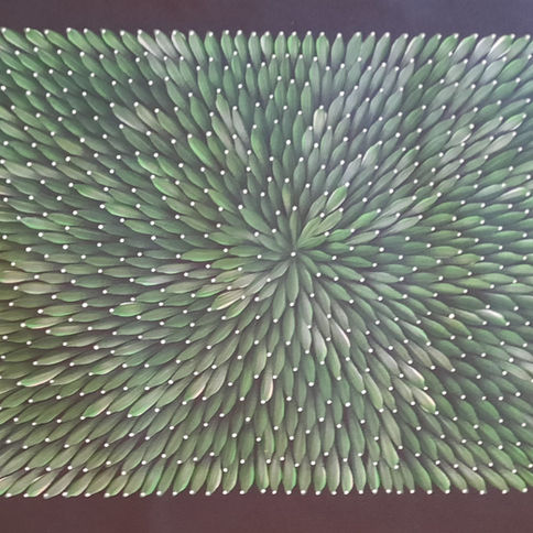 Each brushstroke mimics the natural dispersion of bush seeds carried by the wind across the desert, symbolising resilience and regeneration. The cool blue-green palette evokes a sense of calm and continuity, a visual connection to water, healing, and balance. The repeating patterns speak to the artist’s deep respect for ancestral knowledge, where bush medicine is both a physical remedy and a spiritual gift from the land.